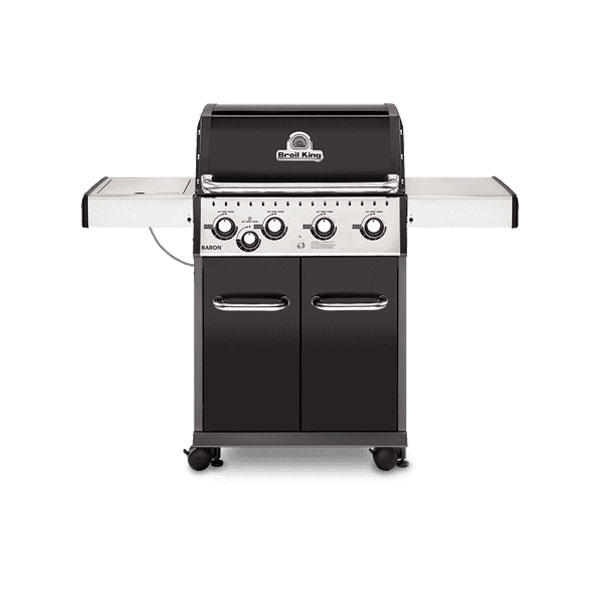 Baron™ 440 features 644 sq. in. total cooking space including porcelain coated warming rack, reversible heavy-duty cast iron cooking grids, stainless steel Flav-R-Wave™ cooking system, 4 stainless steel Dual-Tube™ burners, and stainless steel drop-down side shelves.