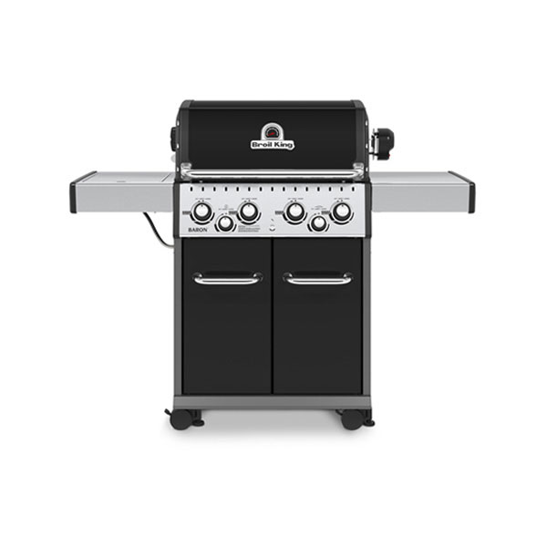 The Baron™ 490 features 444 sq. in. primary cooking surface and includes 4 stainless steel Dual-Tube™ burners, reversible heavy-duty cast iron cooking grids, stainless steel Flav-R-Wave™ cooking system, and electronic ignition. The 490 features stainless steel drop-down side shelves and enclosed cabinet base.