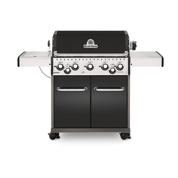 Baron™ 590 features 805 sq. in. total cooking space including porcelain coated warming rack, reversible heavy-duty cast iron cooking grids, stainless steel Flav-R-Wave™ cooking system, 5 stainless steel Dual-Tube™ burners, stainless steel drop-down side shelves and enclosed cabinet base.