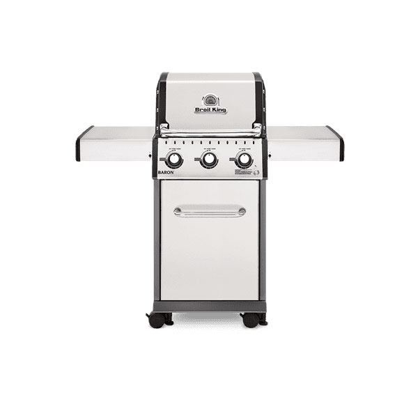 Baron™ S320 features 440 sq. in. total cooking space including porcelain coated warming rack, reversible heavy-duty cast iron cooking grids, stainless steel Flav-R-Wave™ cooking system, 3 stainless steel Dual-Tube™ burners, and stainless steel drop-down side shelves and enclosed cabinet base.