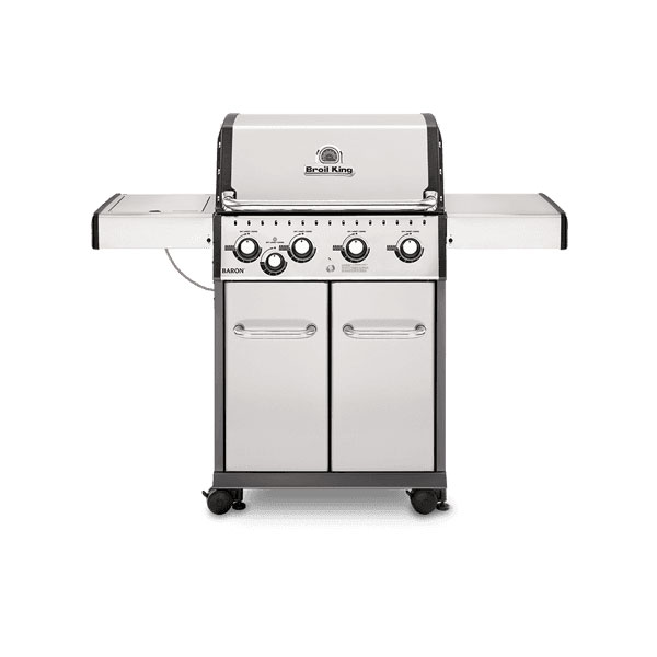 Baron™ S440 features 644 sq. in. total cooking space including porcelain coated warming rack, reversible heavy-duty cast iron cooking grids, stainless steel Flav-R-Wave™ cooking system, 4 stainless steel Dual-Tube™ burners, and stainless steel drop-down side shelves and enclosed cabinet base.