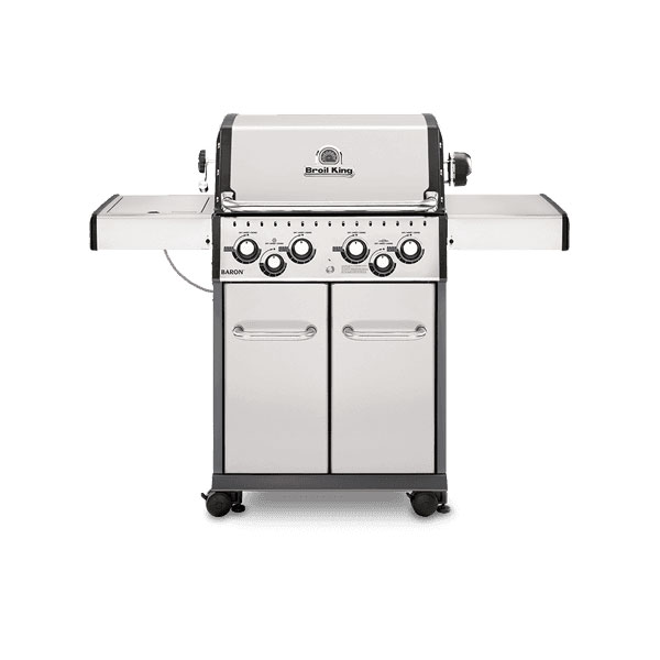 Baron™ S490 features 644 sq. in. total cooking space including porcelain coated warming rack, reversible heavy-duty cast iron cooking grids, stainless steel Flav-R-Wave™ cooking system, 4 stainless steel Dual-Tube™ burners, and stainless steel drop-down side shelves and enclosed cabinet base.