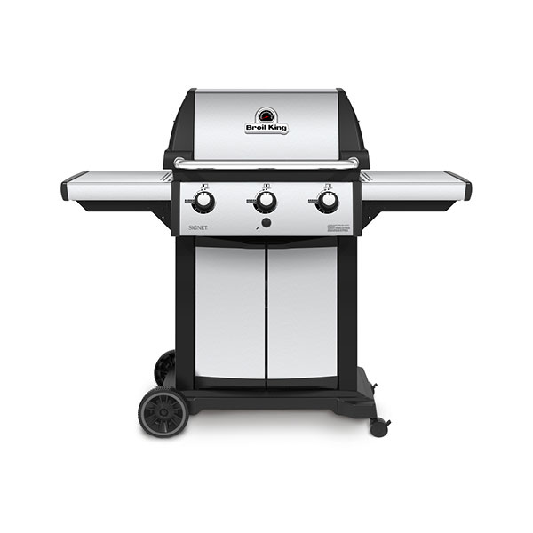 Signet™ 320 features 635 sq. in. total cooking space including porcelain coated warming rack, heavy-duty cast iron cooking grids, stainless steel Flav-R-Wave™ cooking system, 3 stainless steel Dual-Tube™ burners, stainless steel drop-down side shelves and an enclosed cabinet base.
