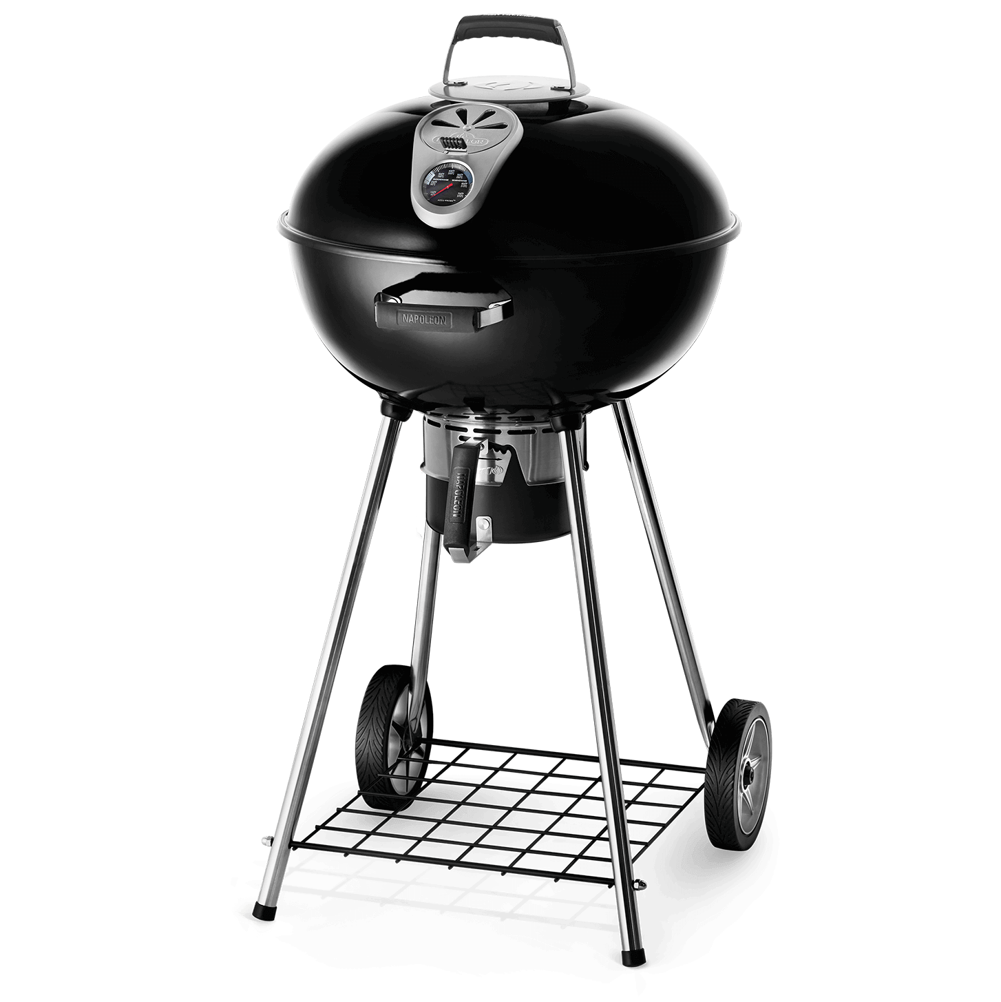 Ideal for charcoal enthusiasts, experience charcoal grilling with Napoleon’s compact and mobile Charcoal Kettle Grill. This grill can easily follow you to wherever the action is thanks to the sturdy all-weather wheels. Grill up to 23 hamburgers at once. Grilling, roasting, and smoking are a breeze, the hinged grids make it easy to reload charcoal or add wood for smoking. Charcoal is all about controlling heat and airflow, the stainless steel heat diffuser evenly distributes heat, and directs spent charcoal to the ash catcher. The improved PRO Air Control system increases airflow and temperature accuracy while preventing water from entering the grill. The lid features a built-in lid hanger and cool touch handle to keep your hands away from the heat while grilling.