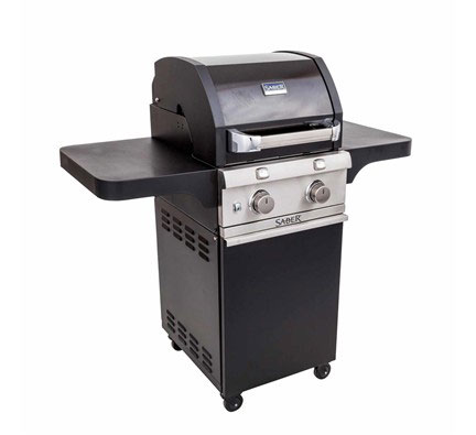 The SABER Cast Black 2-Burner Gas Grill comes with a more reliable ignition system featuring electrodes at each burner, grate-level temperature gauges and sturdy cart design. It also features a black porcelain lid with cast-aluminum end-caps and a black powder-coated cabinet. Plus, enjoy a single access door and sturdy shelves with tool holders.