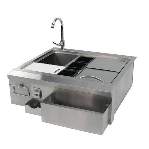 The Jackson Grills 30″ Built-In Cocktail Center is constructed out of stainless steel. Assembled as a complete package, the unit includes a large ice chest with stainless steel cover, a sink, speed rail front bottle storage, bottle boots for chilling mixes, a cutting board, a bottle opener, a towel holder and a cold water tap.