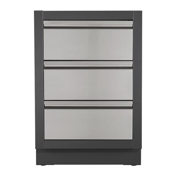 The perfect outdoor kitchen features loads of storage and a durable finish that will stand up to the elements. The OASIS™ Three Drawer Cabinet has stainless steel drawers with an abundance of storage for your Napoleon Accessories and grilling spices. This Carbon colored, powder coated, galvanneal cabinet features increased durability from the two-coat pebbling, finishing system. Installation is a breeze with knockouts for gas and electrical. Levelling feet ensure a balanced surface, even if your patio isn’t perfectly level. Add this cabinet to the perfect outdoor kitchen OASIS™, along with your choice of grill head and under grill cabinet. *Countertop not included