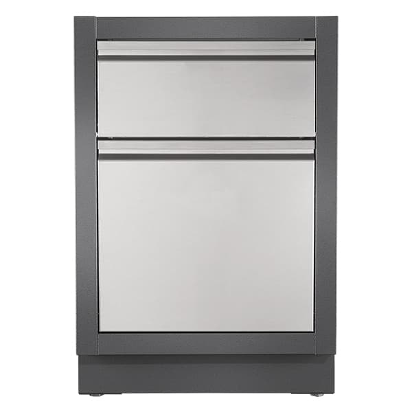 Things can get messy even in the perfect kitchen. Make cleaning up your outdoor kitchen OASIS™ easy with the OASIS™ Waste Drawer Cabinet. Featuring a garbage pull out with a removable waste bin, and a flip down drawer with paper towel holder. This Carbon coloured, powder coated, galvanneal cabinet features increased durability from the two-coat pebbling, finishing system and stainless steel door and drawer front. Installation is a breeze with knockouts for gas and electrical. Levelling feet ensure a balanced surface, even if your patio isn’t perfectly level. Add this cabinet to the perfect outdoor kitchen OASIS™, along with your choice of grill head and under grill cabinet. *Countertop not included
